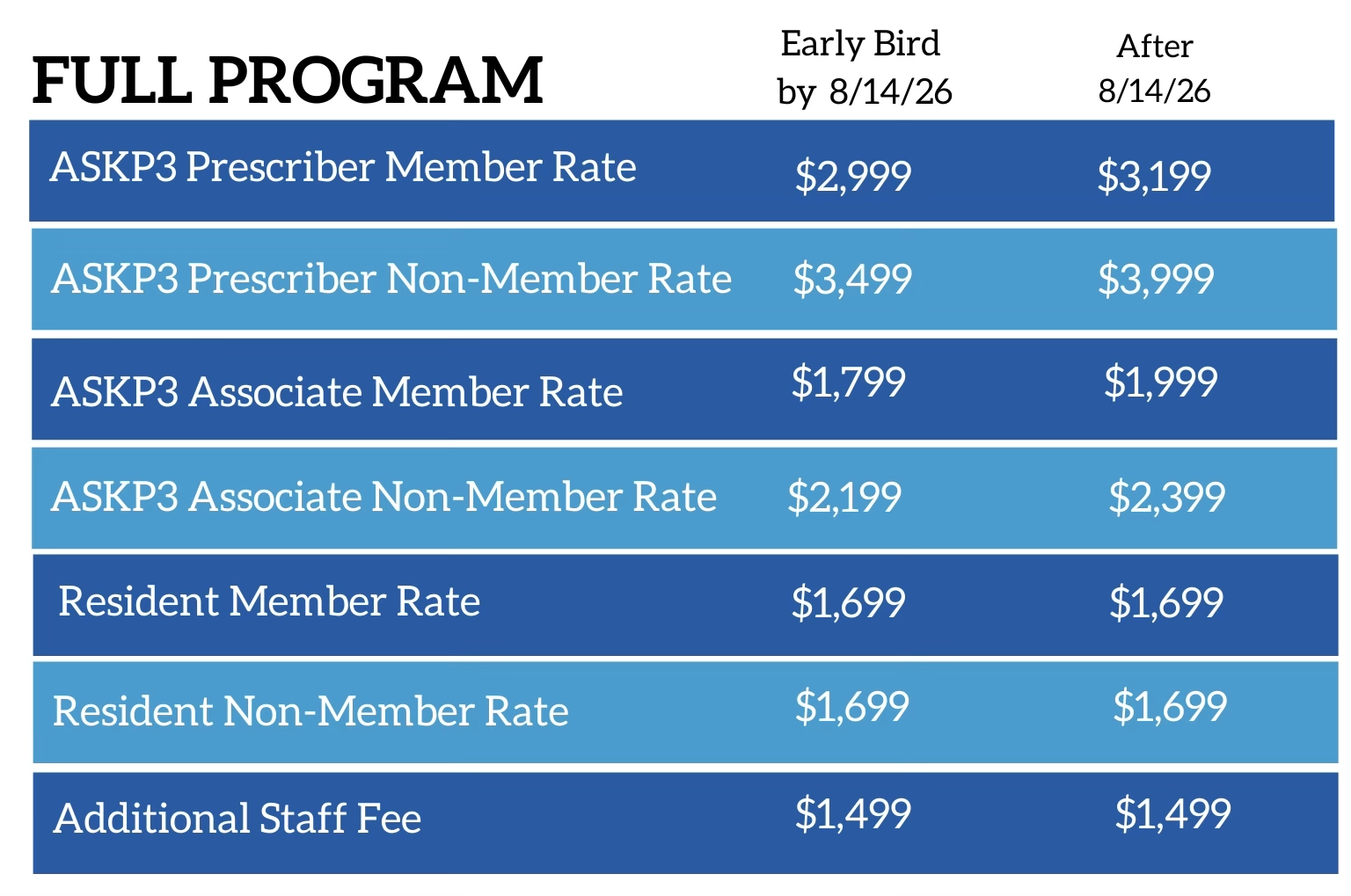 Full payment is due at the time of registration. A refund less a $250 processing fee will be given for written cancellation requests received at ASKP3 Headquarters by August 3, 2026. No refunds will be given after August 3, 2026. Requests must be submitted to info@askp.org. In the event that the program is canceled or postponed, we will not be responsible for any travel costs or expenses, including cancellation/change penalties assessed by airlines, travel agencies or hotels.